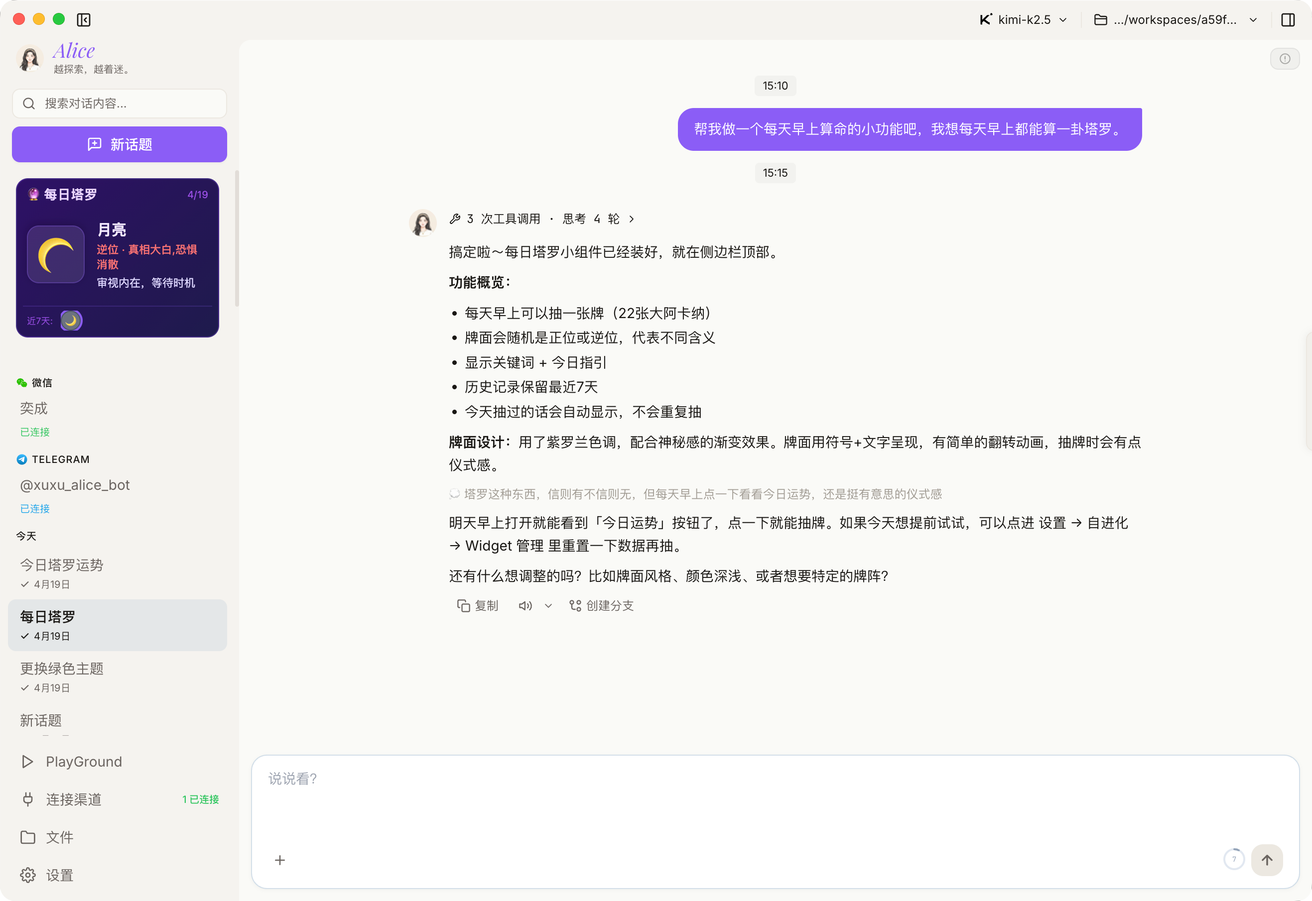 新的页面出现在侧边栏,新的组件挂在对话框旁边。配色变了,习惯学了。这个 Alice,是你塑造的。